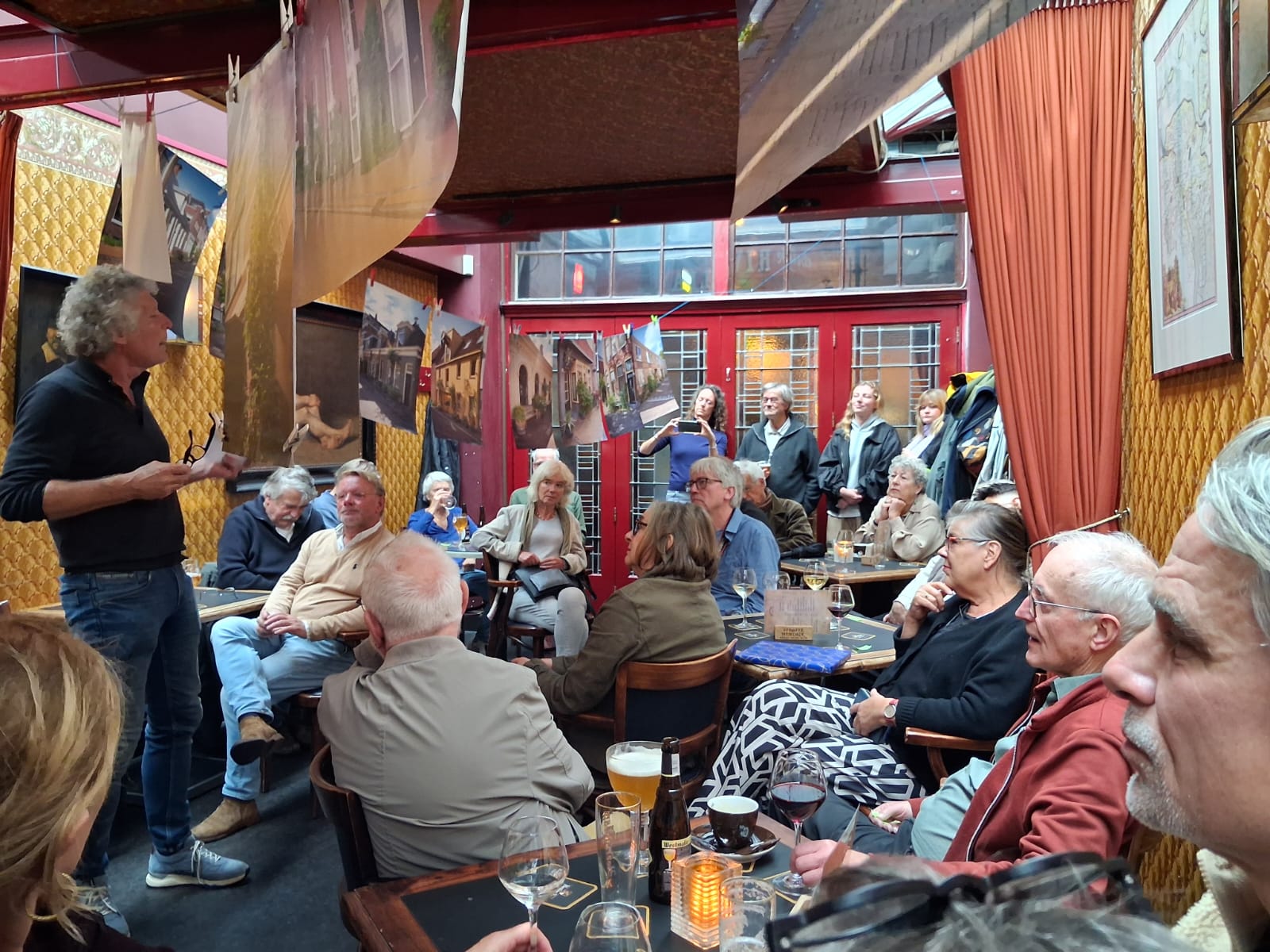 Dick Jager, manager van The Green Office van de uni, houdt een korte toespraak waarin hij de ontwikkeling en het belang van vergroening in de binnenstad schetst. Ook de RUG stimuleert de aanplant van groen voor hun gevels. Of het ermee te maken heeft? Wie weet, maar Groningen staat maar liefst fier op de tweede plaats in The Quality of Life-ranking, en dat nog zonder een ‘Facade Garden’-criterium: https://www.numbeo.com/quality-of-life/rankings.jsp. We kijken terug op een bijzonder gezellige bijeenkomst en hebben nu al zin in het lustrum in 2026.